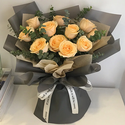 【温澜潮生】精选11枝香槟玫瑰,尤加利叶装饰。