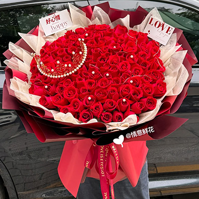 • 【世纪爱恋】99支顶级红玫瑰心形造型,1个皇冠(款式随机),满天星环绕。