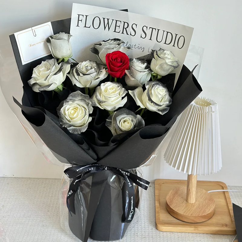 花材: 精选10朵黑骑士玫瑰,1朵红玫瑰。