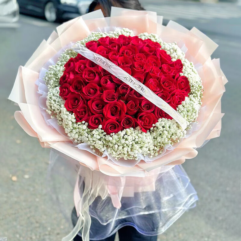 花 材:精选52朵红玫瑰,白色满天星外围环绕,白色英文缎带装饰花面。