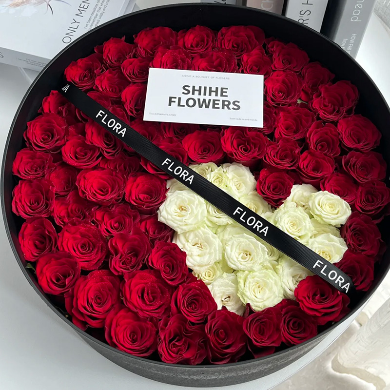 花材: 精选60枝红玫瑰,15枝白玫瑰(白玫瑰心形造型),一条缎带装饰花面。