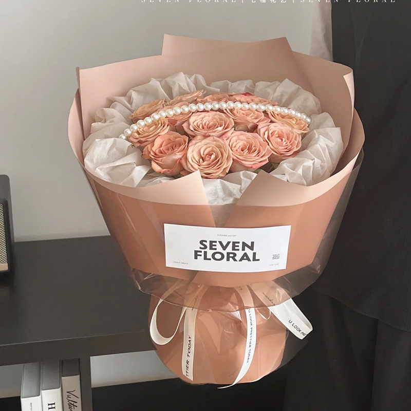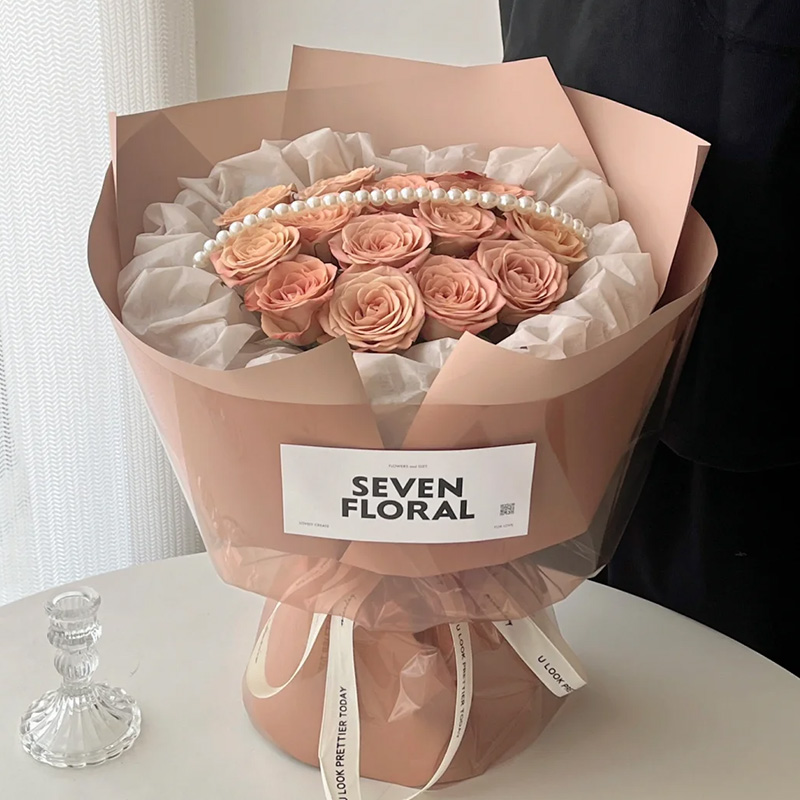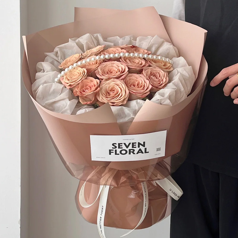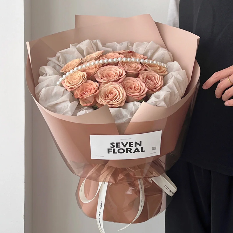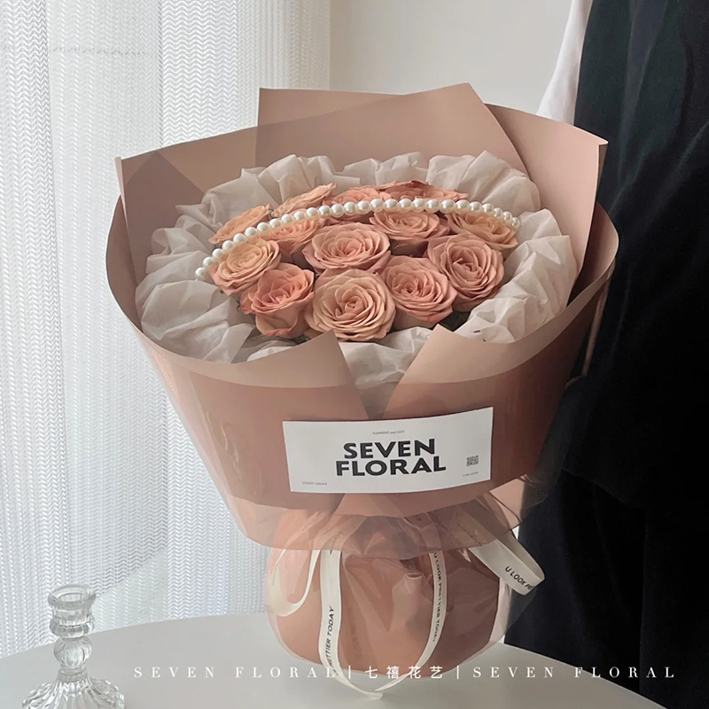 花材: 精选13枝卡布奇诺玫瑰,1条珠串,白色纸内衬,同色系小香风包装。