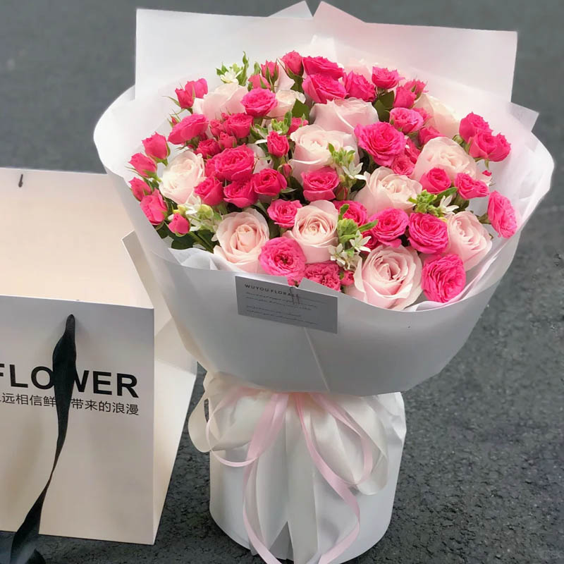 包 装:白色雪梨纸内衬,白色韩素纸外包,粉色/白色花结。
