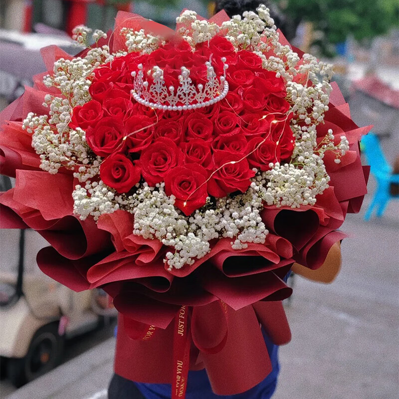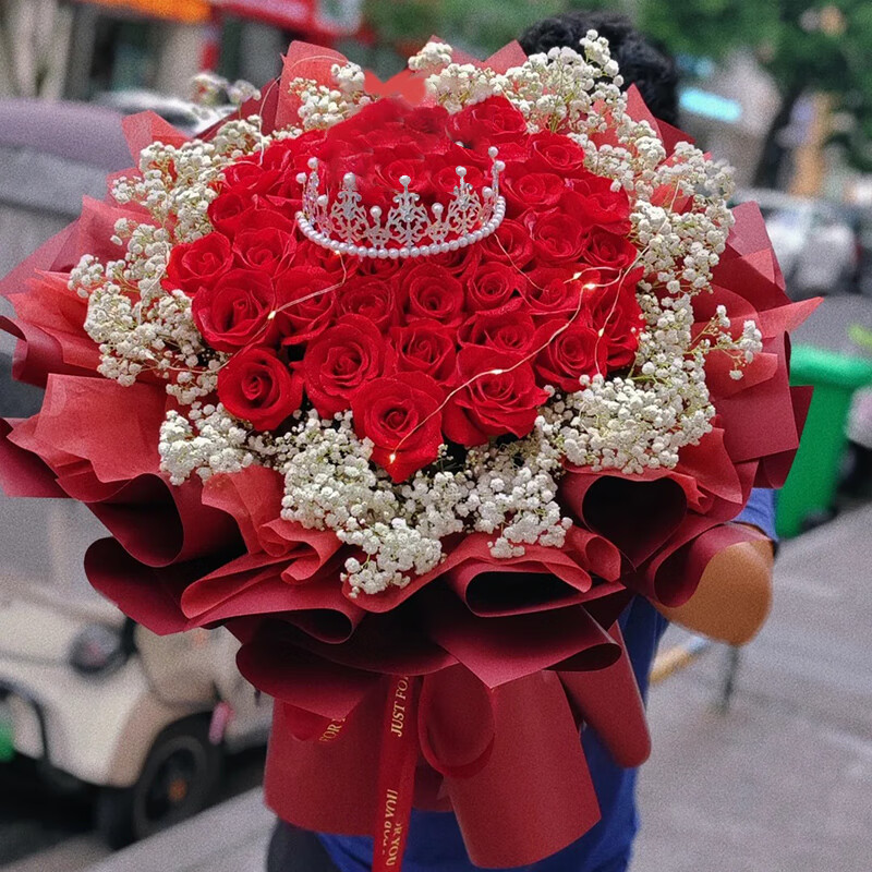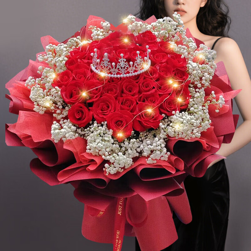 花 材:33朵红玫瑰,1个皇冠(款式随机),1条灯带,搭配白色满天星环绕。