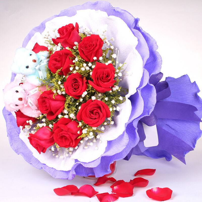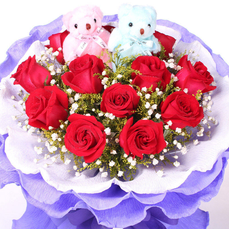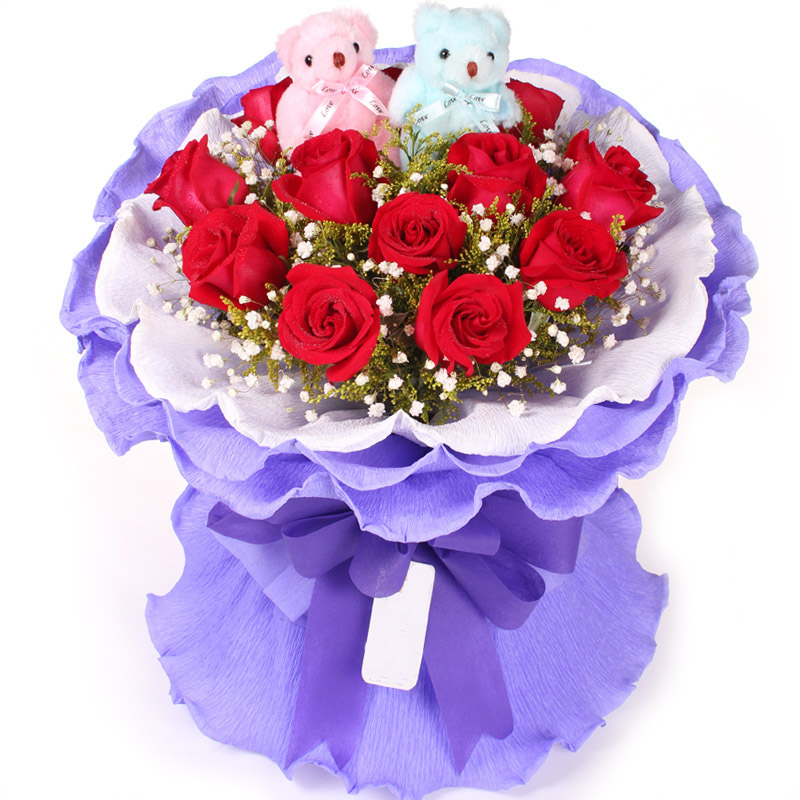 花 材:11支红玫瑰,满天星、黄莺间插,随机赠送两只可爱的小公仔。