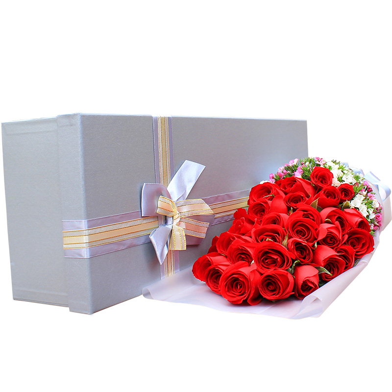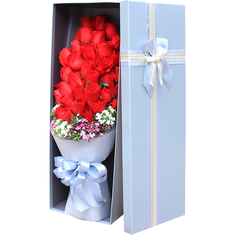 花 材:33枝红玫瑰,搭配石竹梅装饰。