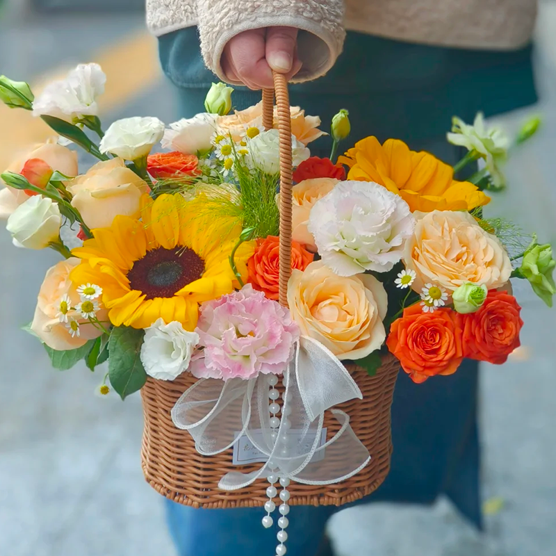 花篮里的春天 - 精选8枝香槟玫瑰,2枝向日葵,1朵粉色康乃馨,3支多头橙色泡泡,4支浅色多头洋桔梗,搭配洋甘菊、喷泉草、尤加利叶装饰。