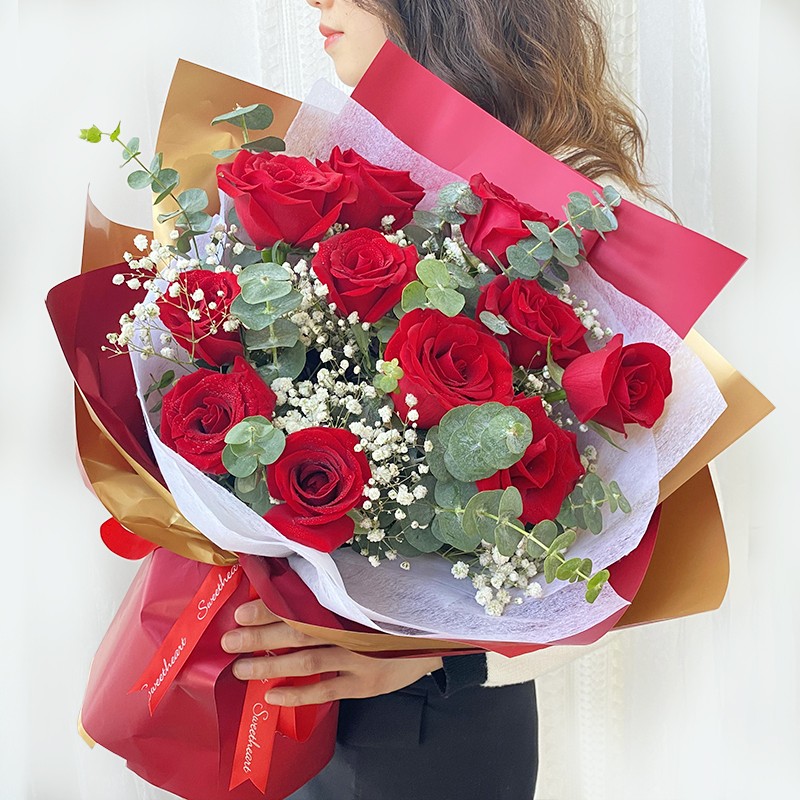 - 花材11枝卡罗拉红玫瑰、搭配白色满天星、尤加利点缀。