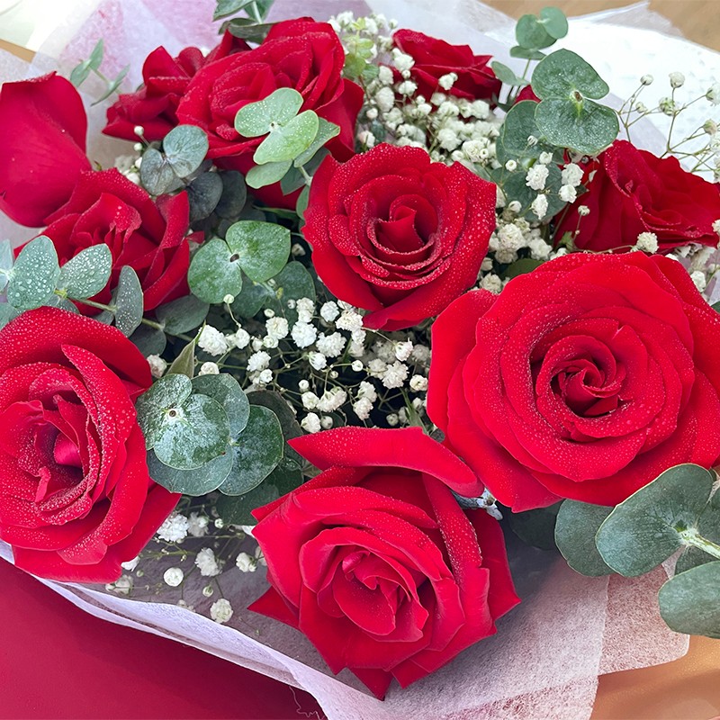 - 一心一意的爱 - 11枝卡罗拉红玫瑰、搭配白色满天星、尤加利点缀。