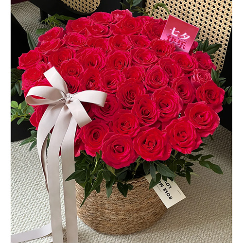 【我只爱你】精选52朵红玫瑰,白色蝴蝶结装饰花面。