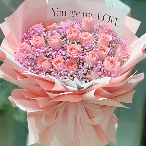 【粉黛佳人】19朵戴安娜粉玫瑰,粉色满天星间插丰满。