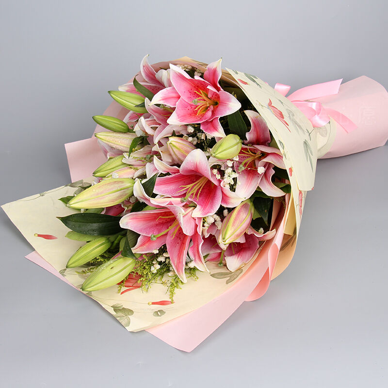花 材:精心挑选21朵香水百合,搭配满天星、黄莺、栀子叶。