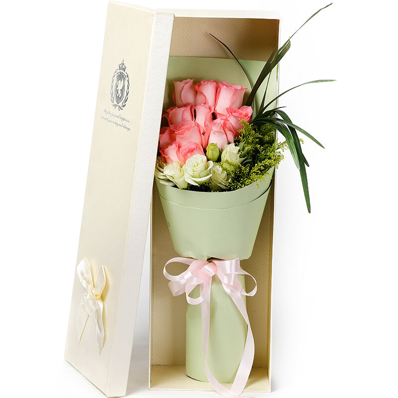 花材: 11支精品粉玫瑰,搭配适量白色洋桔梗、黄莺、书带草。