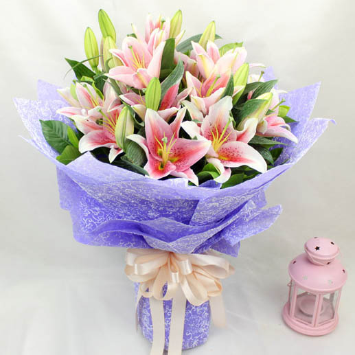 花 材:8枝粉色多头西伯香水百合,搭配绿色新鲜叶材。