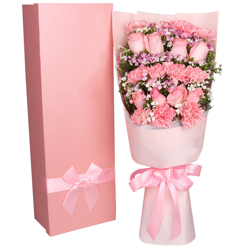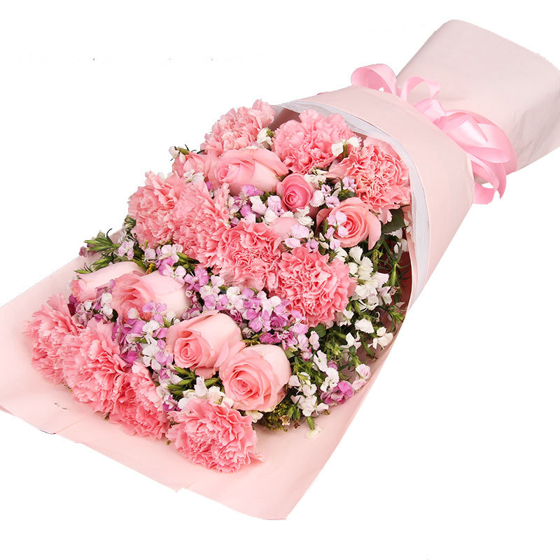 花材: 11朵粉康乃馨,8朵粉玫瑰,搭配相思梅、黄莺穿插点缀。