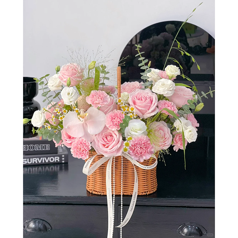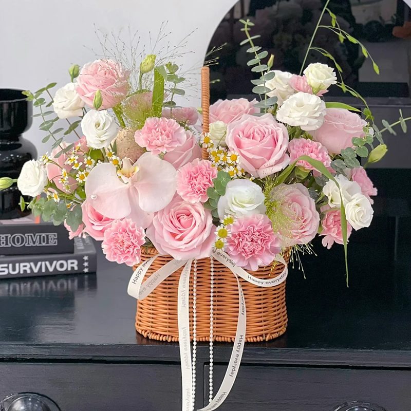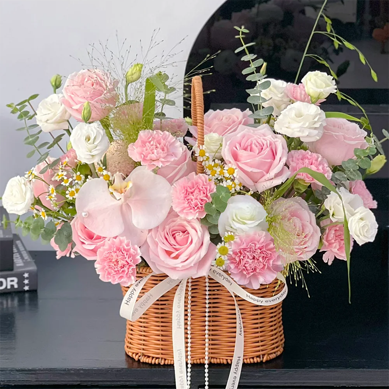 包 装:精美手提花篮,提手用珠串和缎带装饰。(篮筐和配饰等具体以当地实物为准)