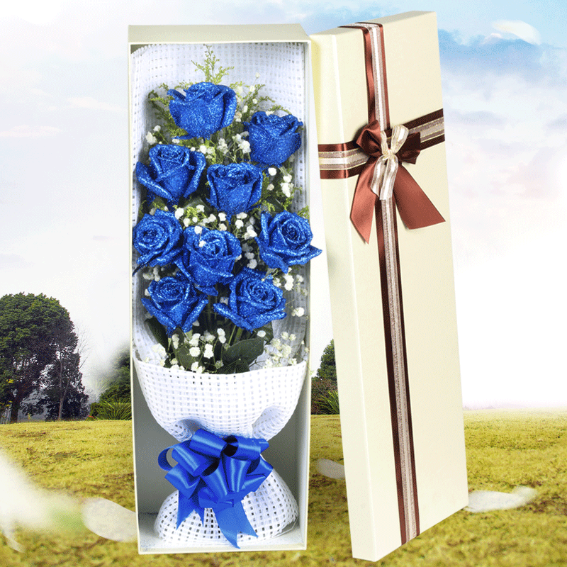 花材: 9支精品蓝色妖姬,搭配满天星装饰。