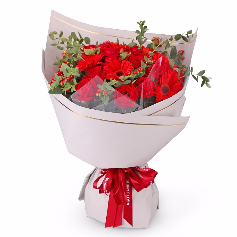 花 材:精选33朵红玫瑰,6支红色太阳花,火龙珠、尤加利尖叶装饰。