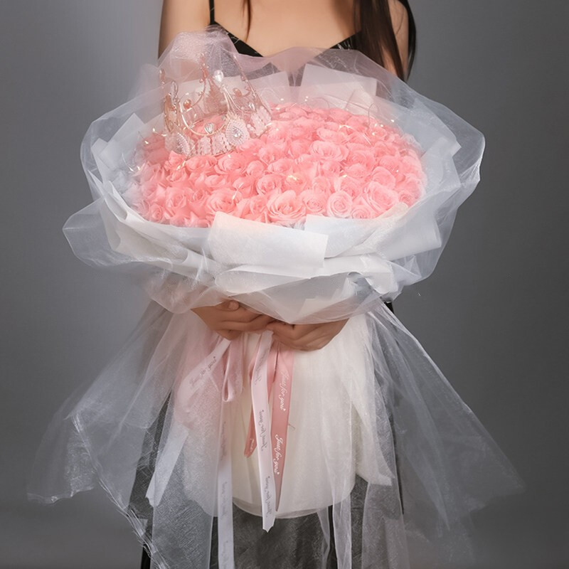 花 材:精选99朵粉玫瑰,搭配皇冠装饰。