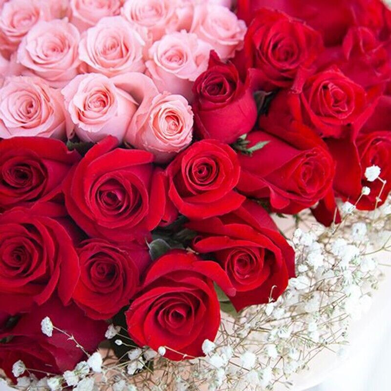 花材: 精选99朵玫瑰,粉玫瑰心形造型,红玫瑰环绕,外围白色满天星装饰。