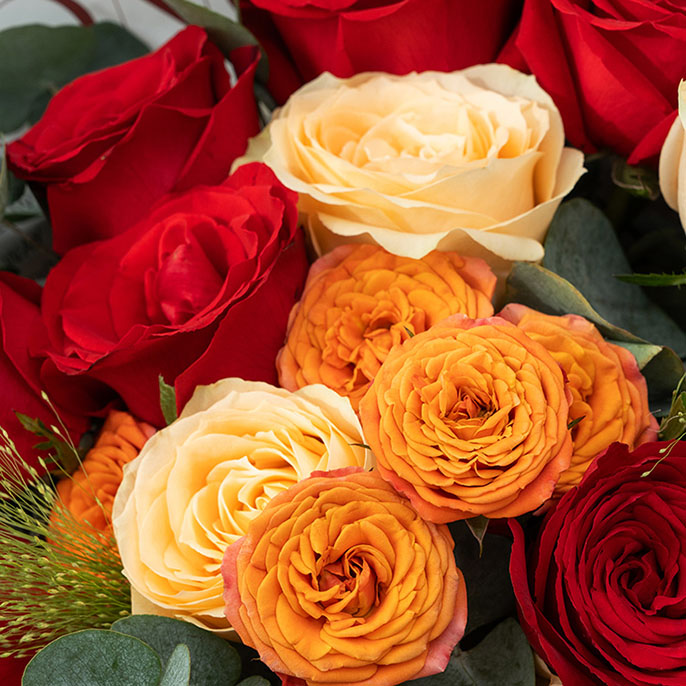 花材: 红玫瑰14枝,香槟玫瑰5枝,橙色多头泡泡3枝(6头以上/枝),喷泉草2枝,尤加利叶若干。