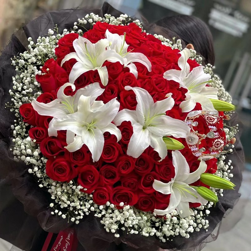 - 花材99朵卡罗拉红玫瑰,5枝多头白色香水百合,1个皇冠,满天星围边点缀。